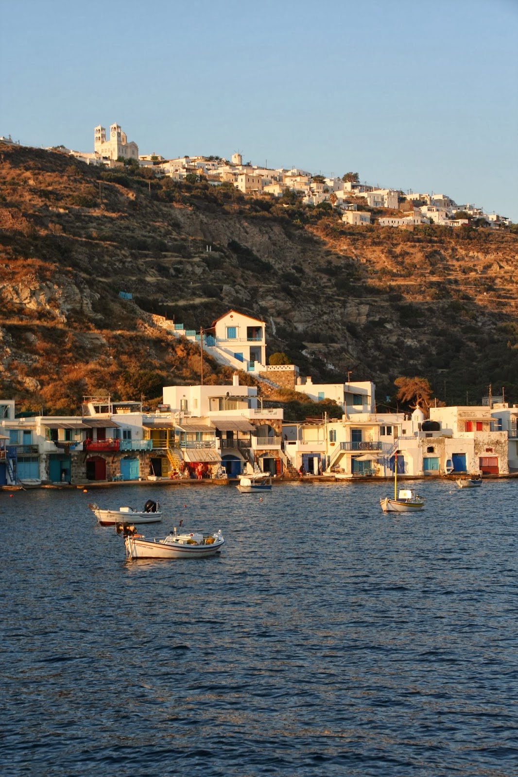 OK, taking a step back from the beaches for a minute. We took our buggy down to the small fishing village of Klima for sunset. This sleepy little gem is tucked away at the bottom of the hill (a big hill...) from one of the islands major towns, Plaka. Klima is tiny though... it only takes a few minutes to walk along the entire waterfront, which is most of the entire village. It is a fishing village, through and through, and the residents have a touch of flare. They decorate their homes with the brightest colors, which makes for some perfect scenery as those colors light up in the setting sun and cast their shimmering and colorful reflections in the water. This is easily one of my favorite pictures of the trip. This little kid was just having a great time splashing in the water and running from dock to dock. His mom and dad came out shortly after and started joking around with each other... they seemed like a very happy family. Further down the way, some folks were taking an early evening dip in the sea. It was quite an idillic place.