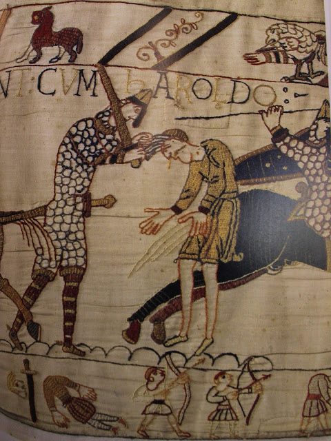 The Bayeux Tapestry is a medieval historical accounting of the Norman conquest of England in 1066. The tapestry is 70 meters long and it is amazing to see it in reality and walk along its full length and appreciate its beautiful detail. The pictures here are from a book, since pictures of the actual tapestry are forbidden.
